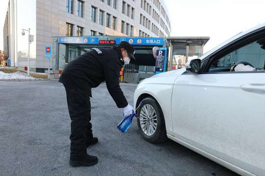 (准备进入地下车库的车辆正接受轮胎消毒)